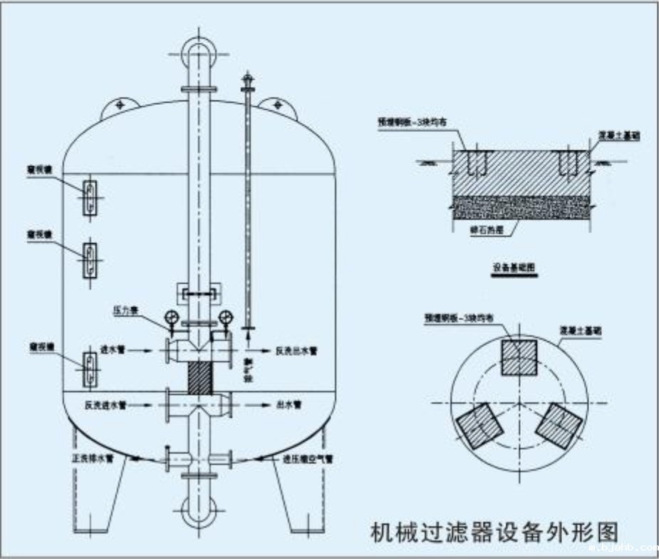 机械过滤器是利用一种或几种过滤介质,在一定的压力下, 使原液通过该介质,去除杂质,从而达到过滤的目的。其内装的填料一般为:石英砂、无烟煤、颗粒多孔陶瓷、锰砂等,用户可根据实际情况选择使用。