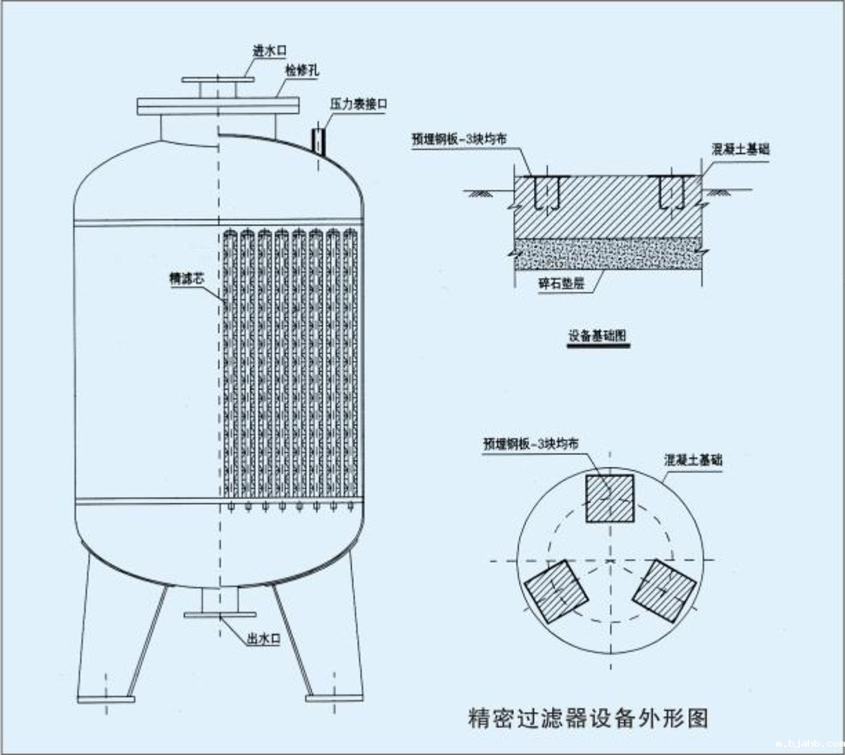 精密过滤器(又称作保安过滤器),简体外壳一般采用不锈钢材质制造,内部采用PP熔喷、线烧、折叠、钛滤芯、活性炭滤芯等管状滤芯作为过滤元件,根据不同的过滤介质及设计工艺选择不同的过滤元件,以达到出水水质的要求。机体也可选用快装式,以方便快捷的更换滤芯及清洗。