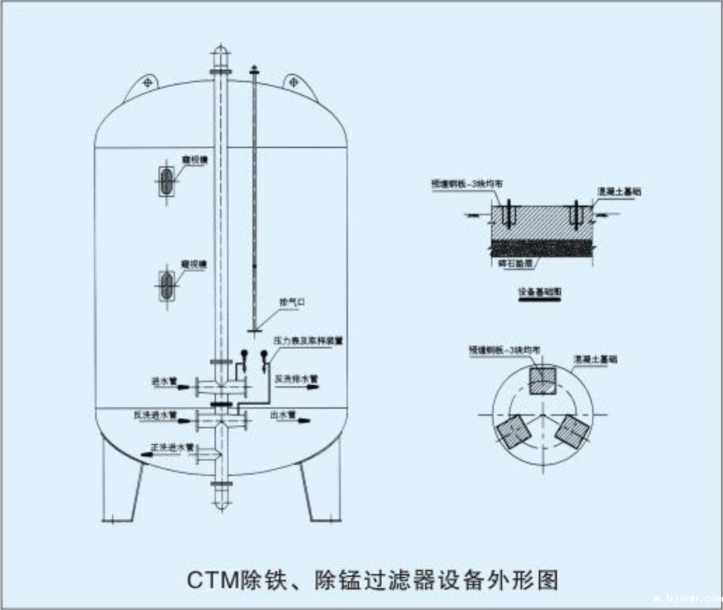 地下水中铁、锰一般以低价状态存在,本装置采用吸气装置向深井水源吸水口加气,水气经充分接触混合,使水中的低价铁、锰氧化成为高价状态,然后经过“成熟”的石英砂或天然锰砂滤料过滤、吸附、氧化而达到处理目的。