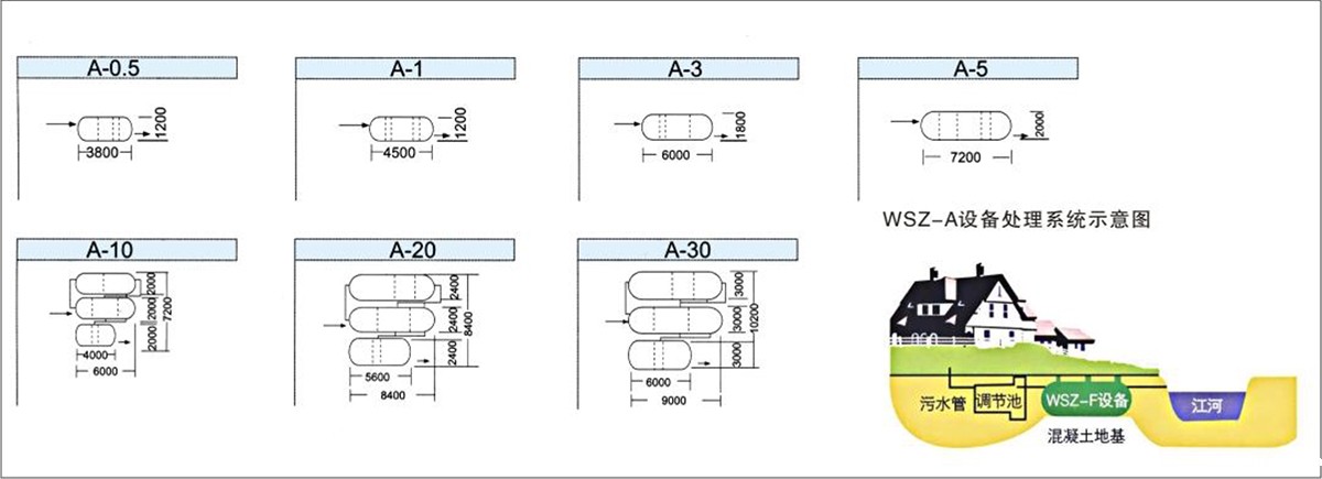 5、污泥池:二沉池的所有污泥均用空气提至WSZ-A的污泥池内进行好氧消化,污泥池的上清液加流至调节池内进行再处理,消化后剩余污泥很少,一般1-2年清理一次,清理方法可用吸粪车从污泥池的检查孔伸入污泥底部进行抽吸后外运即可。( WSZ-A0.5-5m³/h污泥采用大厌氧消化)